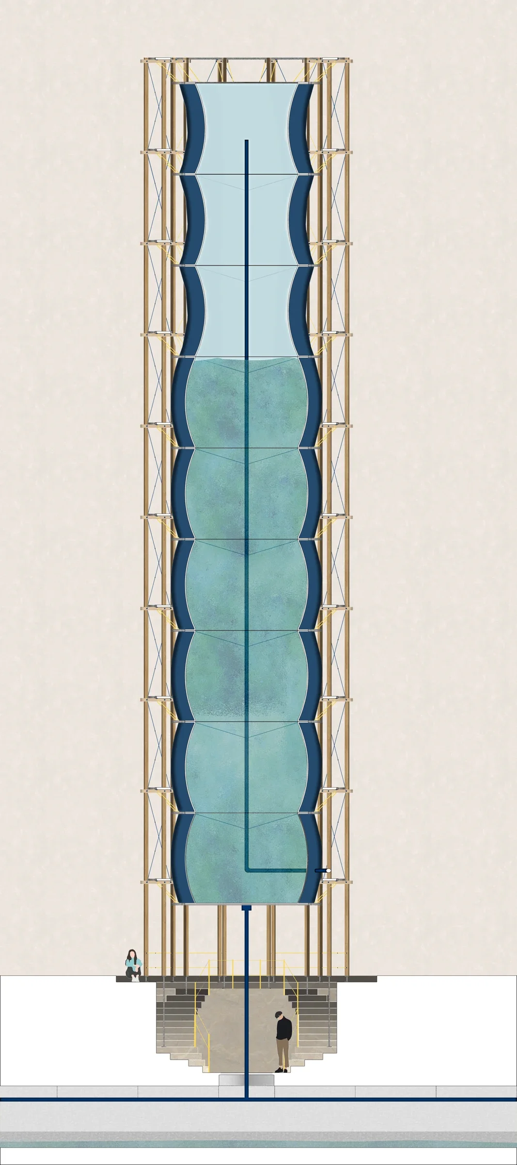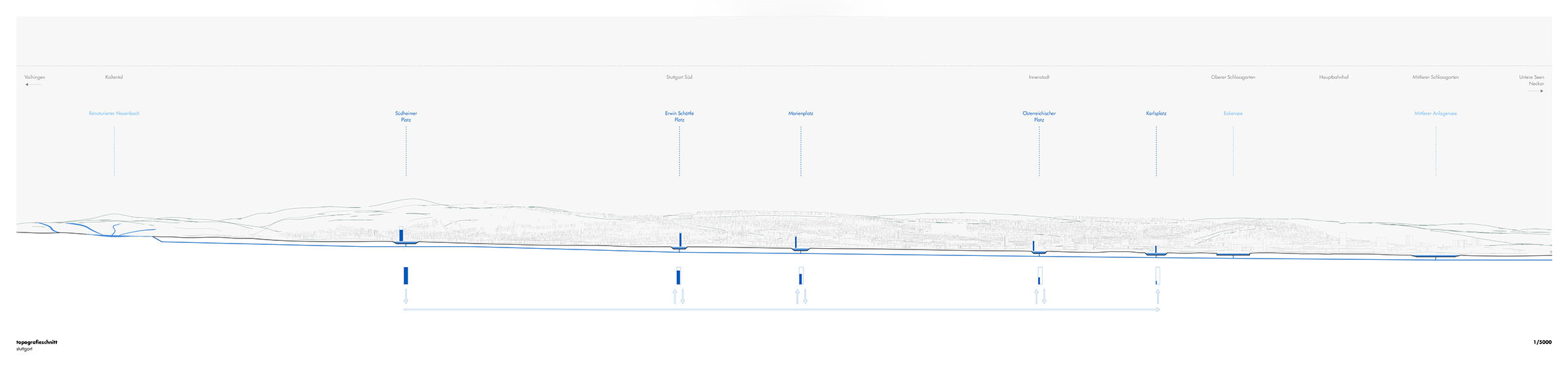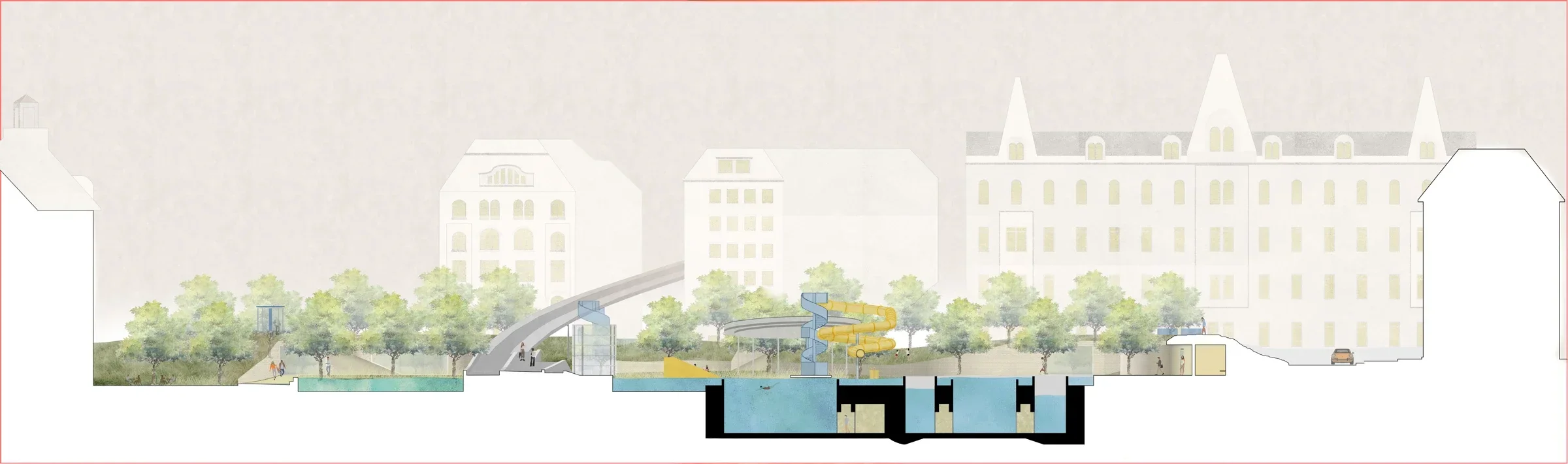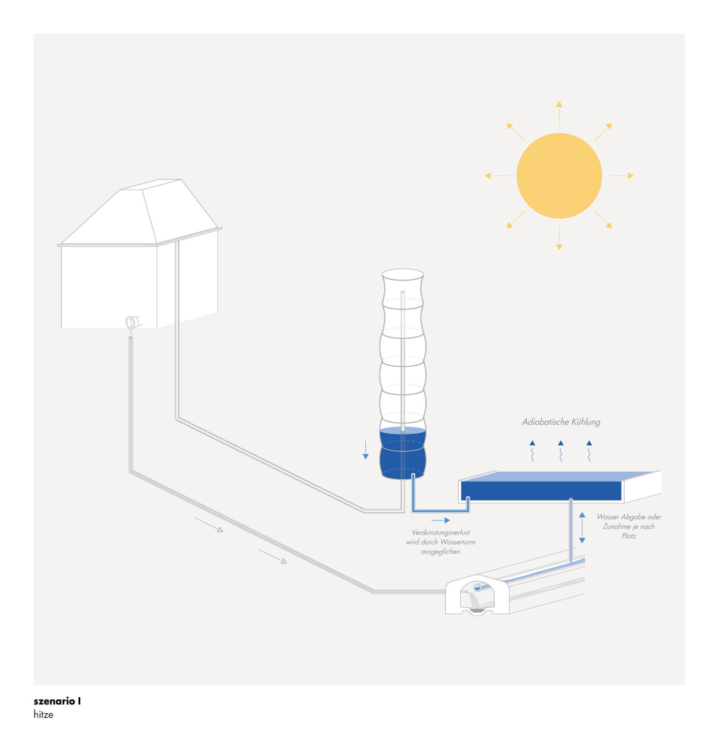 Ein wasserbasiertes Stadtsystem zur Klimaanpassung, Regenwassernutzung und sozialen Aktivierung urbaner Räume. Statt Wasser schnell abzuleiten, wird es sichtbar, nutzbar und zum zentralen Gestaltungselement des öffentlichen Raums. Wasserorte für heiße Städte.