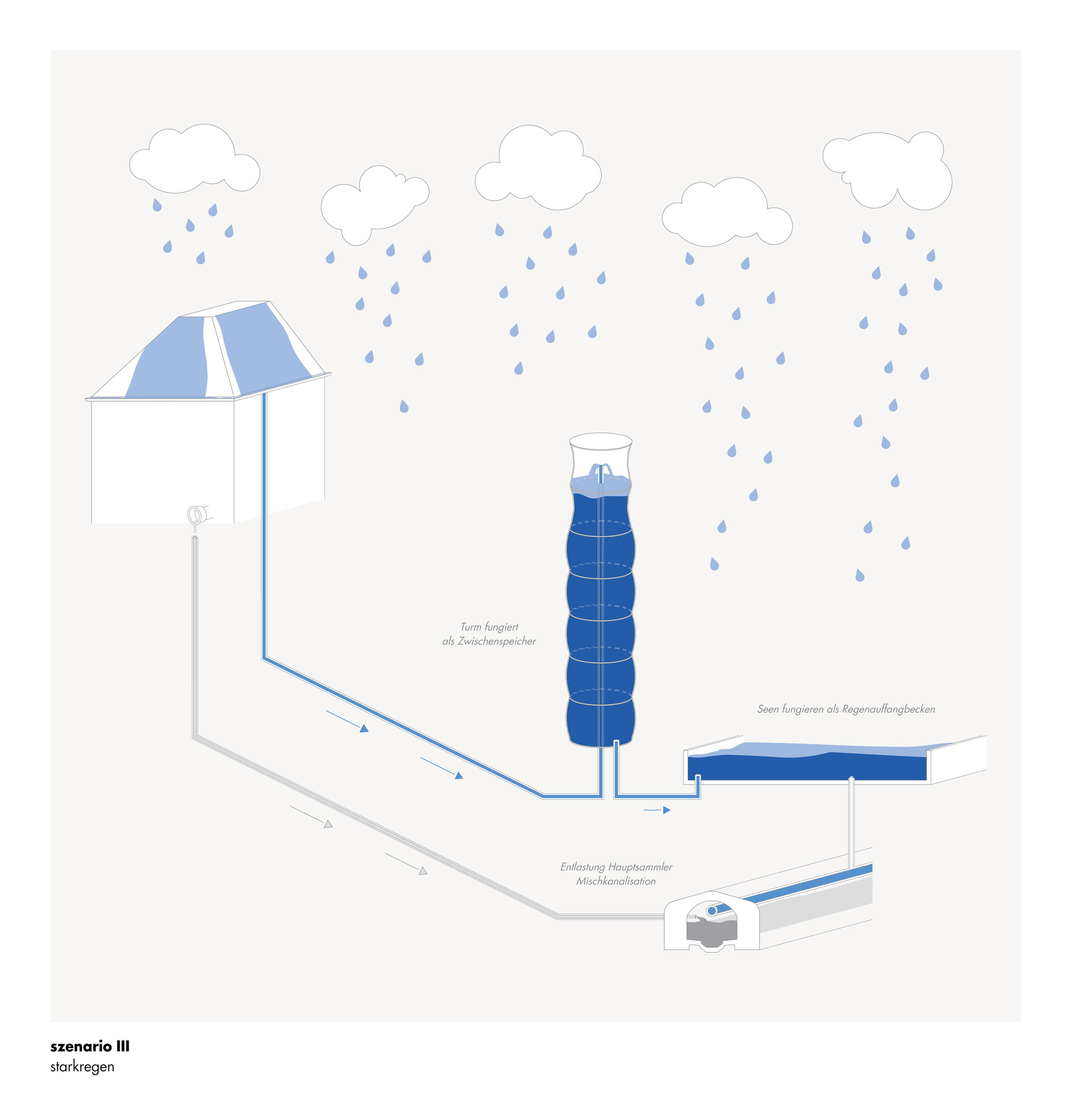 Bestehende Leitungen verbinden sie zu einem stadtweiten Wassersystem. So wird Regenwasser lokal genutzt und gleichzeitig auf Stadtebene gesteuert.